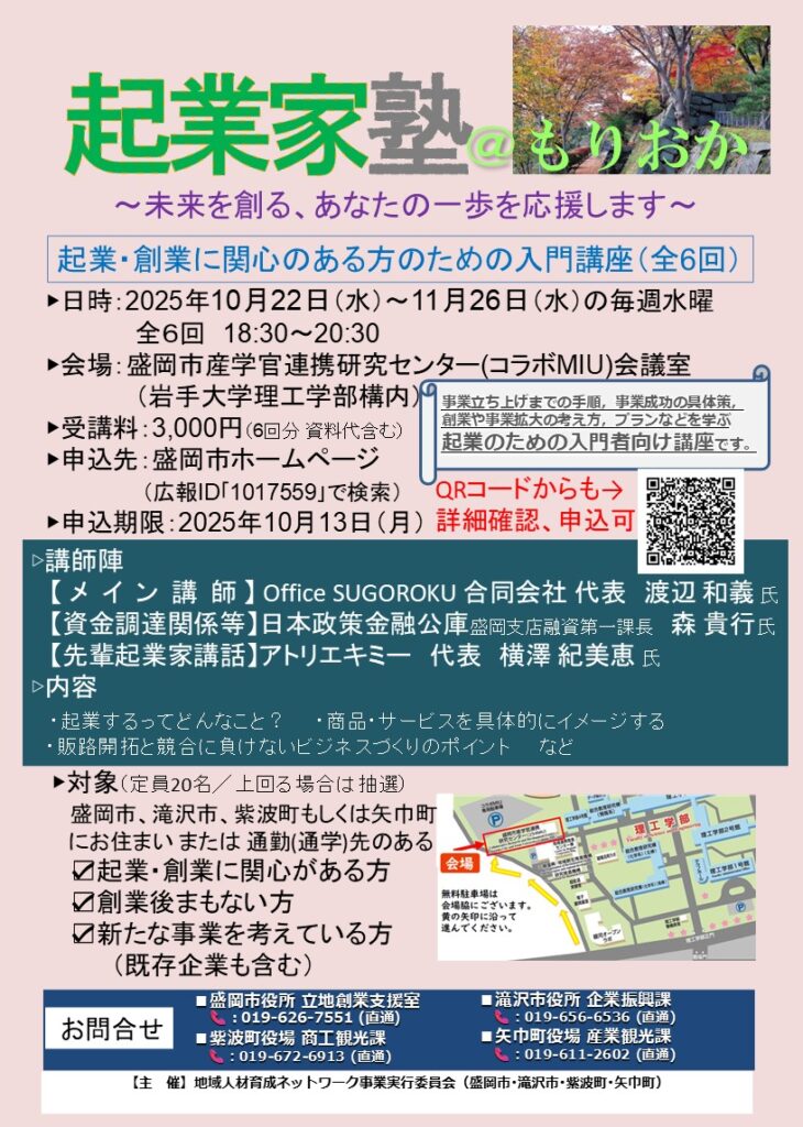 【盛岡市、滝沢市、紫波町、矢巾町】起業家塾@もりおか(2025後期)を開催します(申込10/13まで)